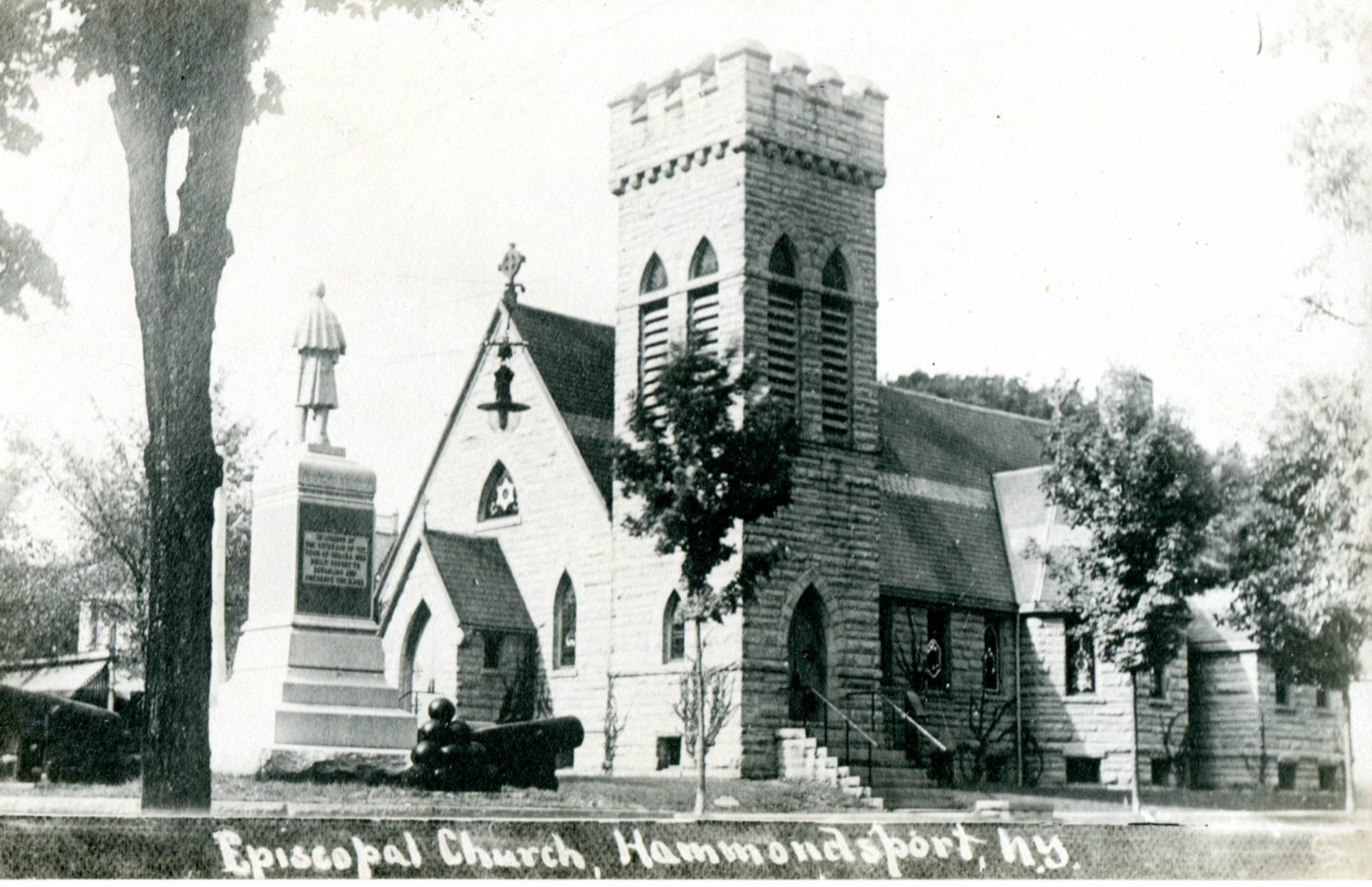 Photo of St. James' Episcopal Church (completed 1895) showing Civil War monument in intersection of Lake and Main Streets, Hammondsport, NY